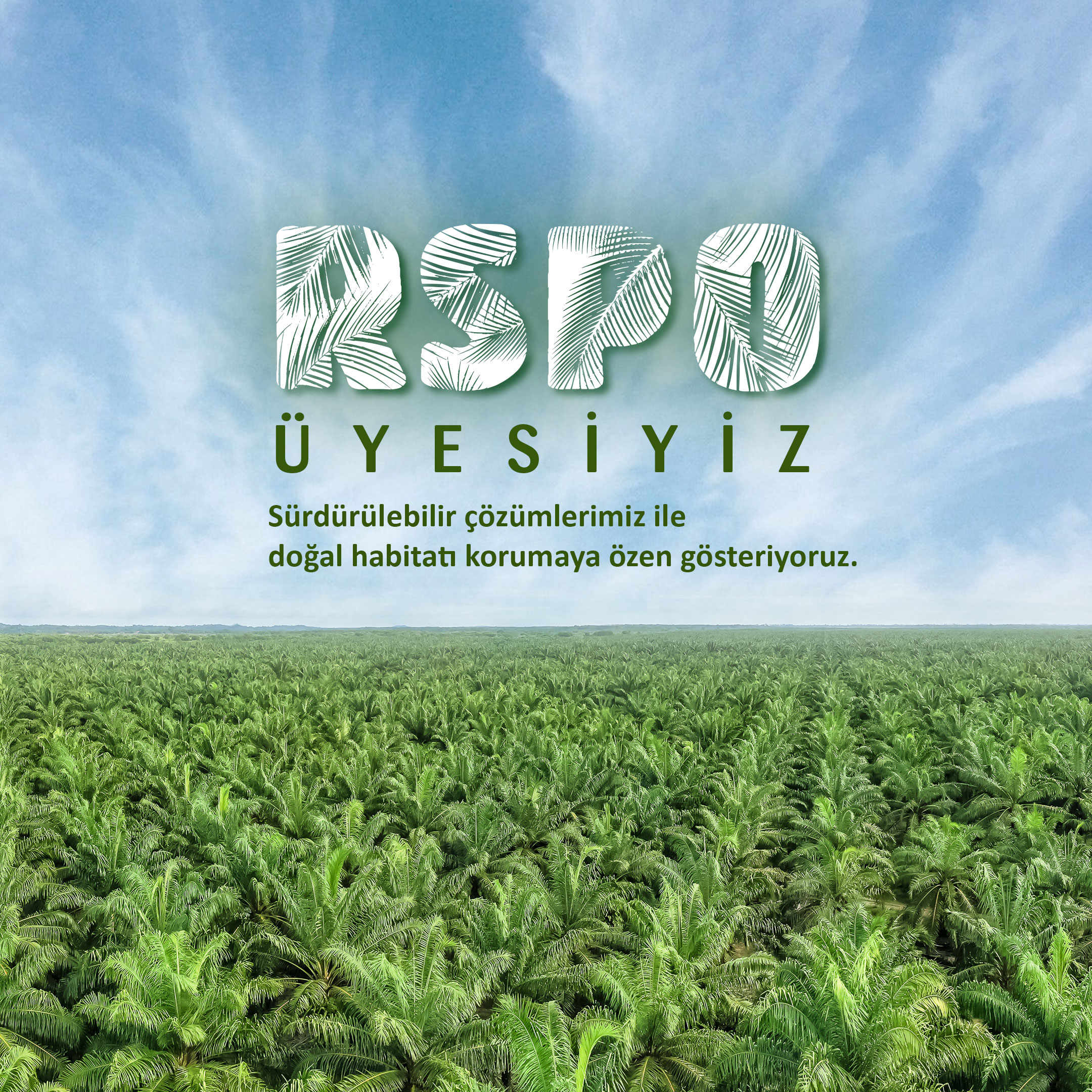 DoÄŸanın yaÅŸam döngüsüne saygı duyuyor; RSPO sertifikalı, sürdürülebilir palm yağı üretimi politikalarına uygun çalışan akredite üreticilerden palm yağı tedariÄŸine özen gösteriyoruz.